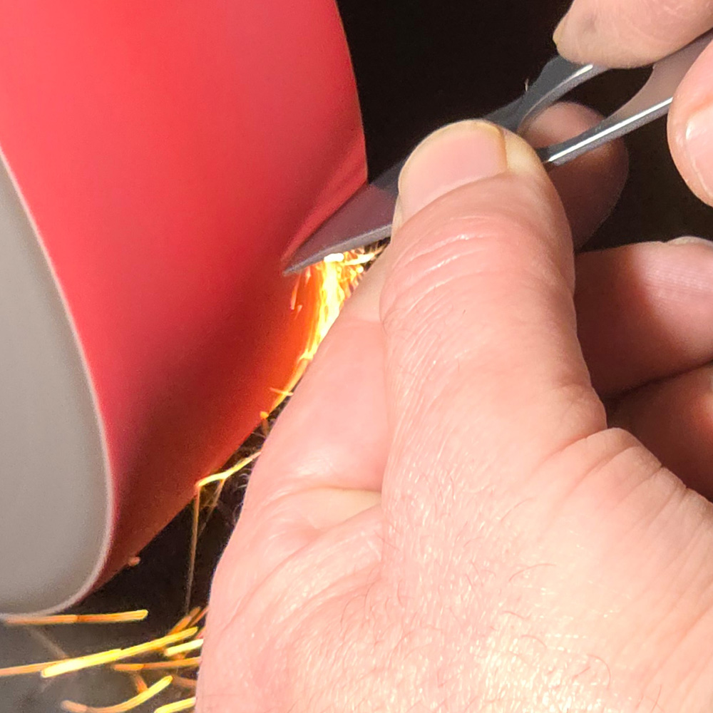 - Der Schliff am Band: Die Klinge wird von unseren erfahrenen Schleifern freihändig am laufenden Schleifband geführt. Durch die meisterhafte Kontrolle von Winkel, Druck und Geschwindigkeit formen wir die Schneide. In mehreren Durchgängen, von groben Schleifbändern für den präzisen Formabtrag bis hin zu feinsten Bändern für eine glatte Oberfläche, arbeiten wir den exakten Klingenwinkel heraus. Dabei legen wir besonderes Augenmerk auf den berühmten "Solinger Dünnschliff". Dieser sorgt dafür, dass die Klinge hinter der Schneide besonders dünn ausgeschliffen ist, was den Schneidwiderstand minimiert und für eine unübertroffene Schnittleistung sorgt.